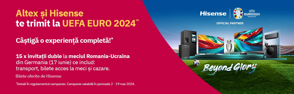 Cumpara orice produs Hisense de la Altex si poti castiga o experienta completa la UEFA EURO 2024: 15 invitatii duble la meciul Romania-Ucraina din Germania (17 iunie) ce includ: