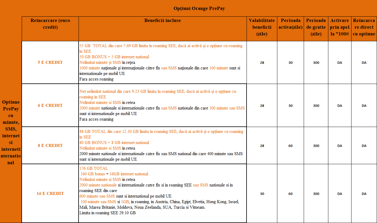 - Exemplu: optiune 5€ credit = 50 GB / optiune 16 € credit = 160 GB Extra bonus (intre 100GB si 300 GB) alocat automat exclusiv din My Orange: